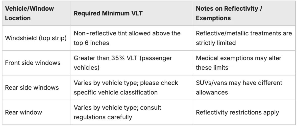 Compliance with Oregon's tint rules is a crucial practical requirement. State laws precisely specify Visible Light Transmission limits, windshield allowances, reflectivity rules, and a medical-exemption process that can affect allowable darkness. Understanding these legal parameters prevents penalties and ensures your vehicle passes safety inspections, so drivers should always verify VLT limits before selecting a darkness level. The table below concisely summarizes Oregon's rules in a quick, scannable format relevant to passenger vehicles and light trucks. Following the table, we'll explain practical compliance tips and highlight the vital role of our expert installers in ensuring legal finishes.
