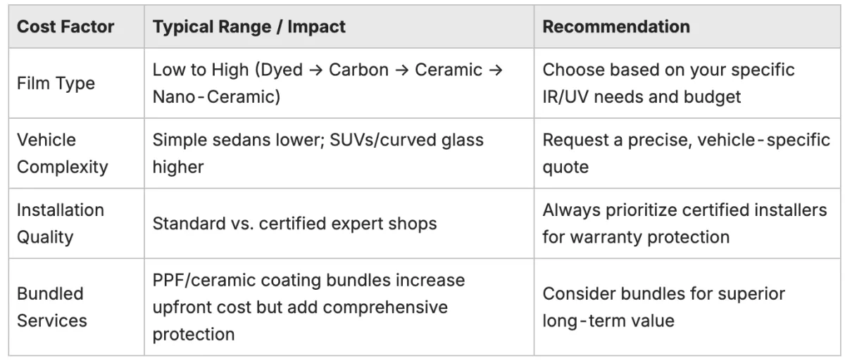 The cost and ultimate value of window tinting are expertly driven by film technology, vehicle complexity, installation quality, and comprehensive warranty coverage. Each factor profoundly influences both the upfront price and your long-term return on investment. Higher-performance films like nano-ceramic typically command a greater upfront cost but deliver superior heat rejection and durability, which can significantly reduce HVAC wear and interior fading costs over time. The EAV table below clearly breaks out common cost factors and their impact, followed by a concise comparison of ceramic and carbon pricing considerations and a summary of our warranty-related value propositions.