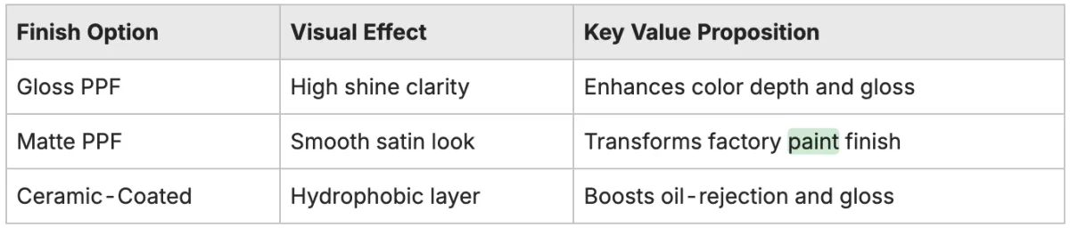Gloss film maximizes clarity and color vibrancy, matte film delivers a satin transformation over existing paint, and ceramic-coated PPF integrates nanoceramic particles for superior water beading, ease of cleaning, and UV protection.