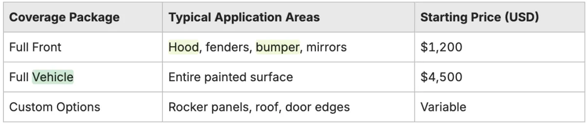 Our transparent pricing structures adapt to every protection need, from targeted front-end coverage to full-vehicle armor. Each package is designed to deliver optimal value and lasting assurance.